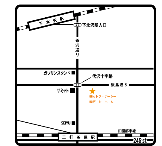 バス約5分「北沢タウンホール」行き「代沢十字路」下車
